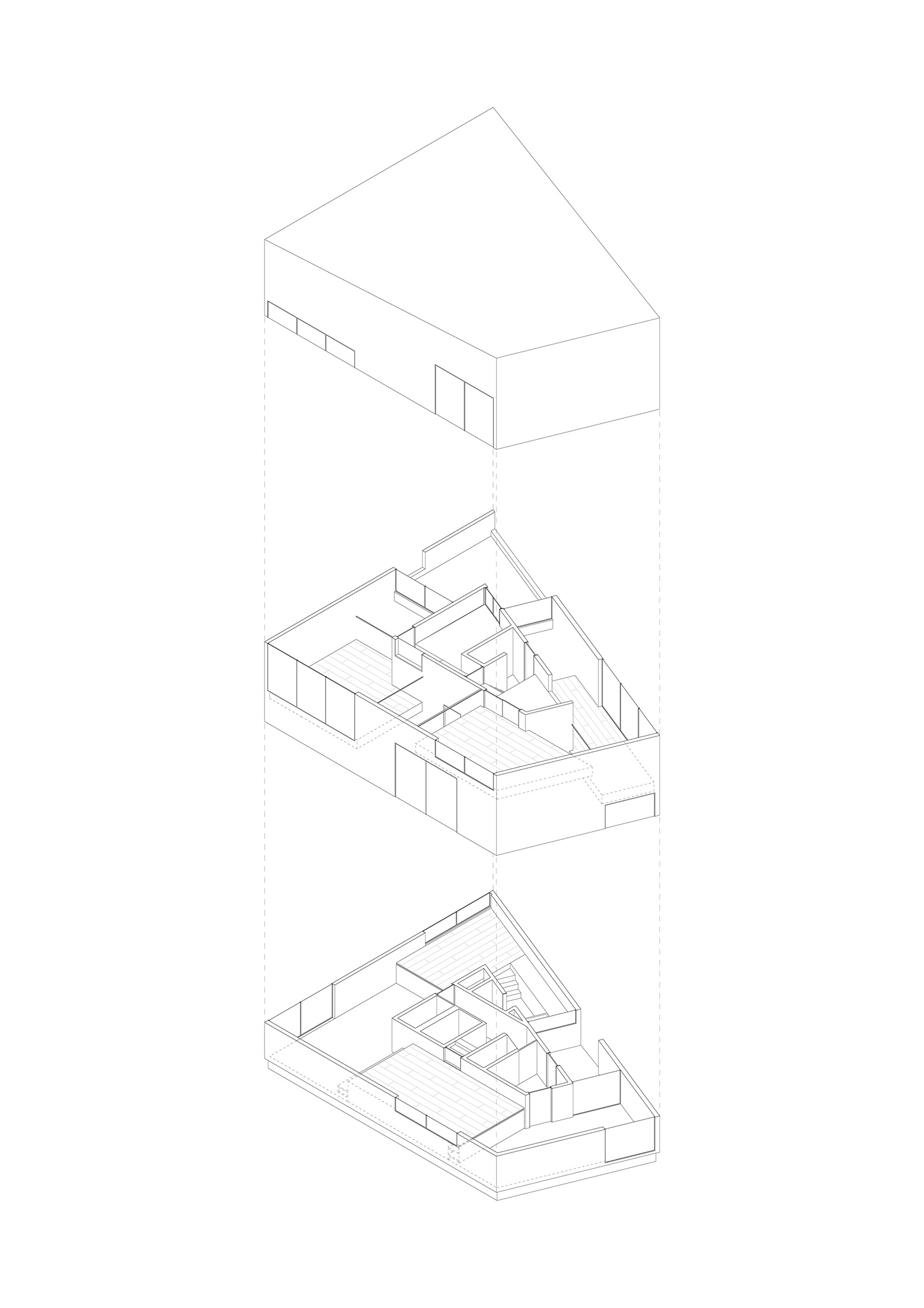 W宅是一座私人住宅兼工作室,位于一块仅占地80平方米的现存不规则场地之上。业主选择这个与自然靠近的宁静之所是想要在此建立一个能作为其开放工作室,举办聚会,与不同人相遇的场所。设计将私密及必要的生活起居功能集中于空间的中心,形成了一个概念上的极小之家,与日本传统空间中的母屋相对应。其他半私密功能围绕中心设置在不同的标高之上,使室内形成一条连续的环形空间,行程类似于缘侧的空间。窗洞向不同的城市场景空间与自然山体开放,将室内空间向外释放。